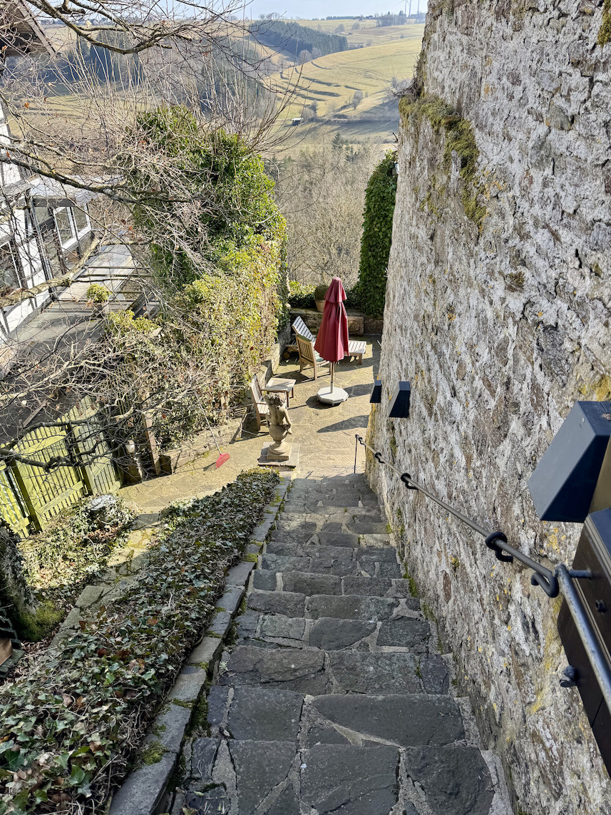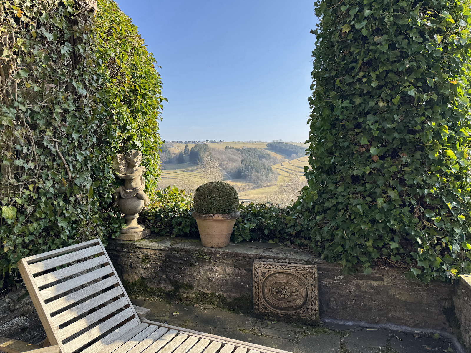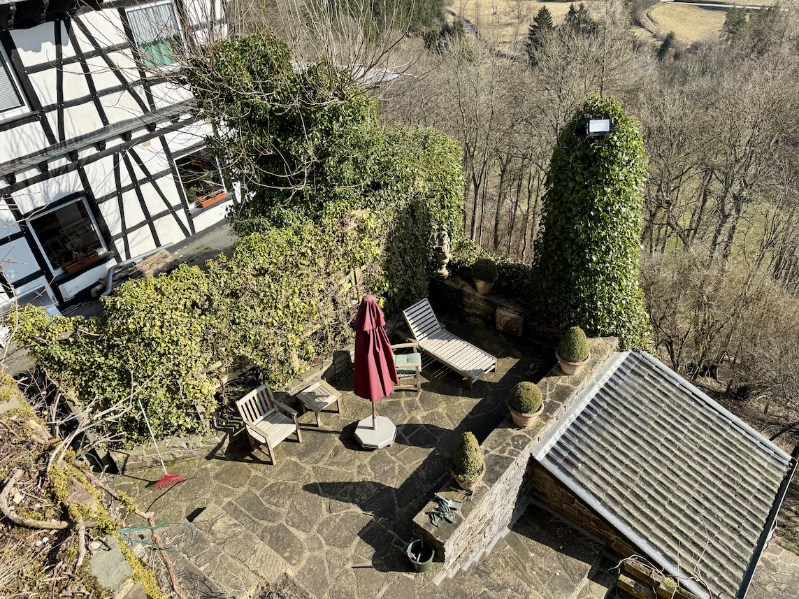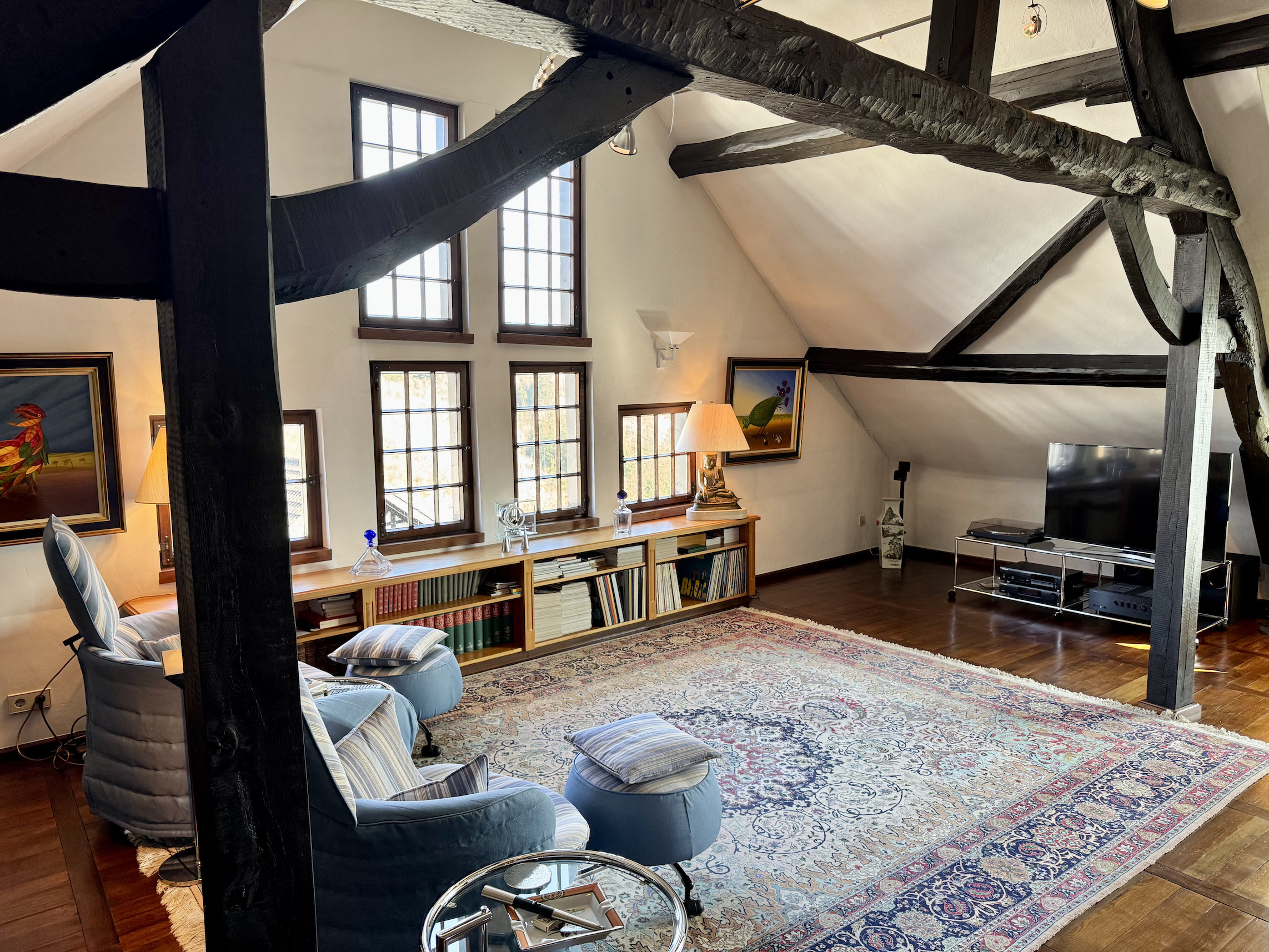 Auf der ersten Etage befinden sich zwei Schlafzimmer, ein Ankleidezimmer (ehemaliges Kinderbad) und ein luxuriös ausgestattetes Badezimmer, das 2018 aufwendig saniert wurde. Von hier aus gelangt man in das großzügig ausgebaute Dachatelier, das mit einem Kaminofen für wohlige Wärme sorgt und einen einzigartigen Fernblick in die Eifel bietet.
