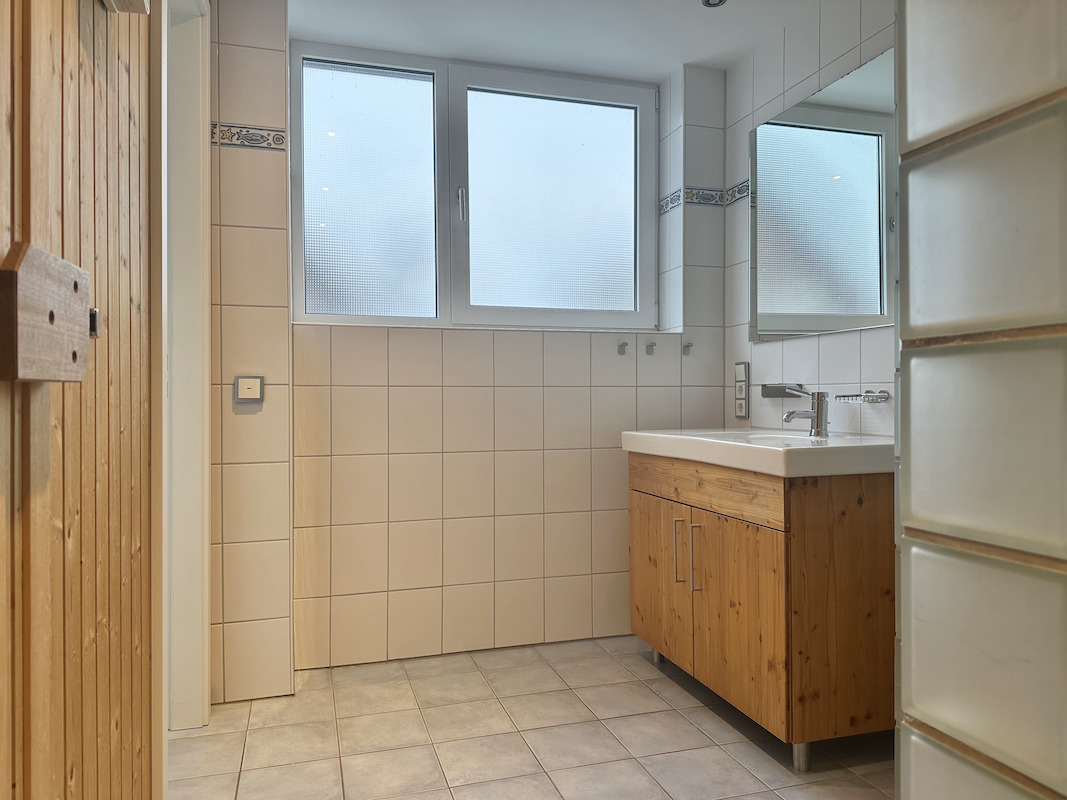 Das 1. Obergeschoss umfasst eine Empore, ein Schlafzimmer sowie ein Badezimmer mit integrierter Sauna.