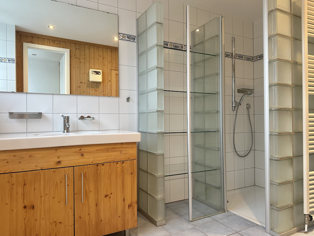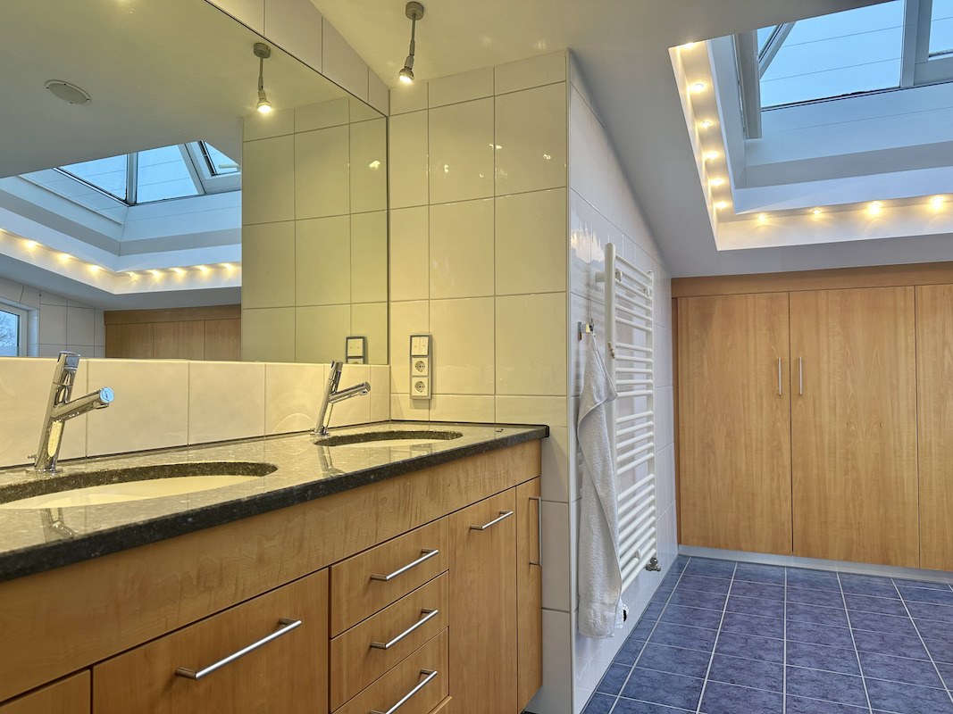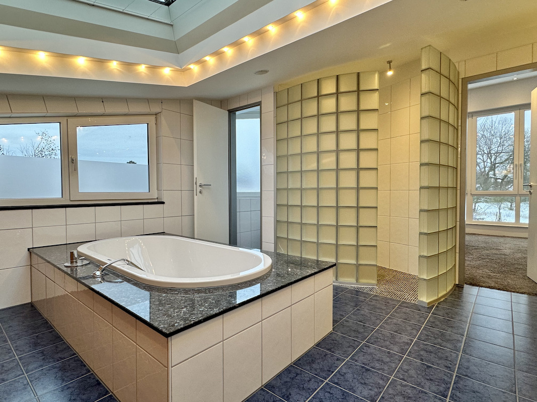 Im Staffelgeschoss befindet sich das Elternschlafzimmer mit Klimaanlage, großen bodentiefen Fenstern und Blick ins Grüne. Ergänzt wird diese Ebene durch ein großzügiges Badezimmer mit Dusche und Badewanne sowie ein separates Fernsehzimmer mit Zugang zu einer weitläufigen Terrasse.