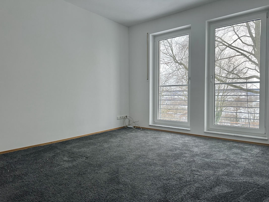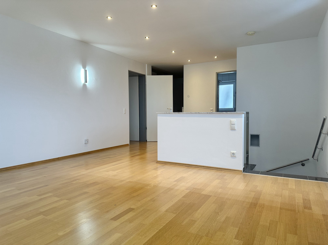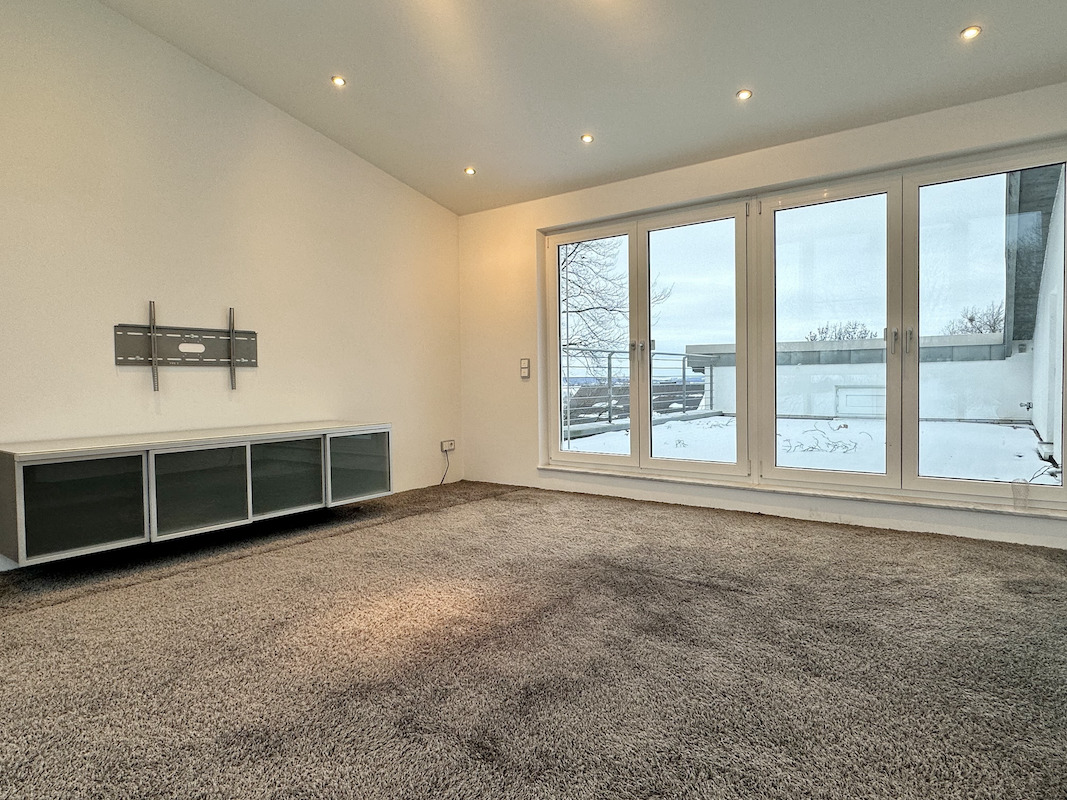 Von hier aus gelangt man in das helle Wohnzimmer mit bodentiefen Fenstern, angrenzendem Essbereich und einem Kaminofen. Die Küche, direkt an das Esszimmer angrenzend, ist mit einer hochwertigen Einbauküche ausgestattet und verfügt über eine integrierte Sitzecke. Zudem befinden sich auf dieser Ebene ein Schlafzimmer sowie ein angrenzendes Badezimmer.