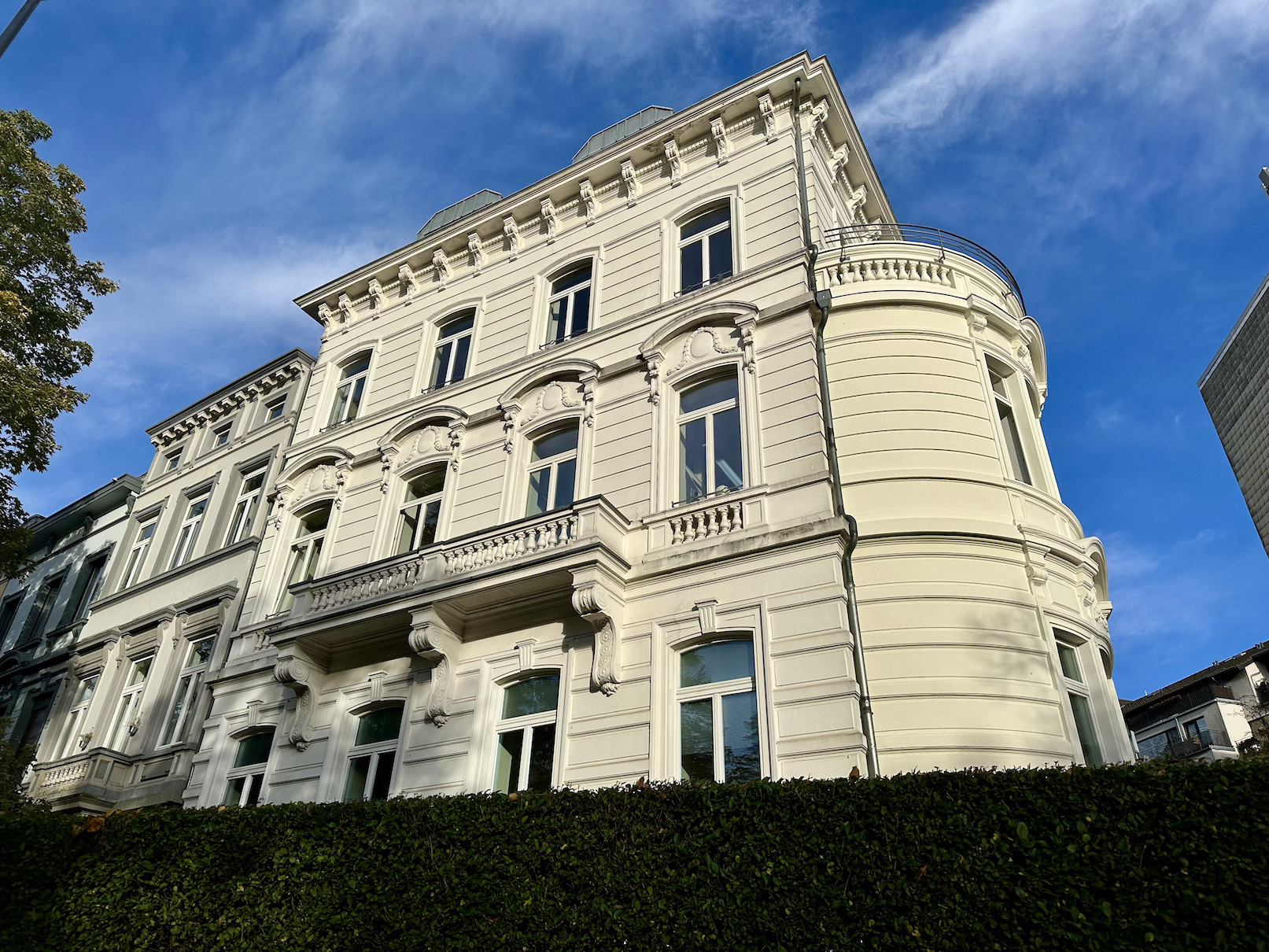 Hier befindet sich eine hochmoderne Zahnarztpraxis. Die Praxisräume harmonieren stilvoll mit der sanierten Altbausubstanz und schaffen eine Verbindung zwischen medizinischer Funktionalität und architektonischem Charme der Jahrhundertwende.