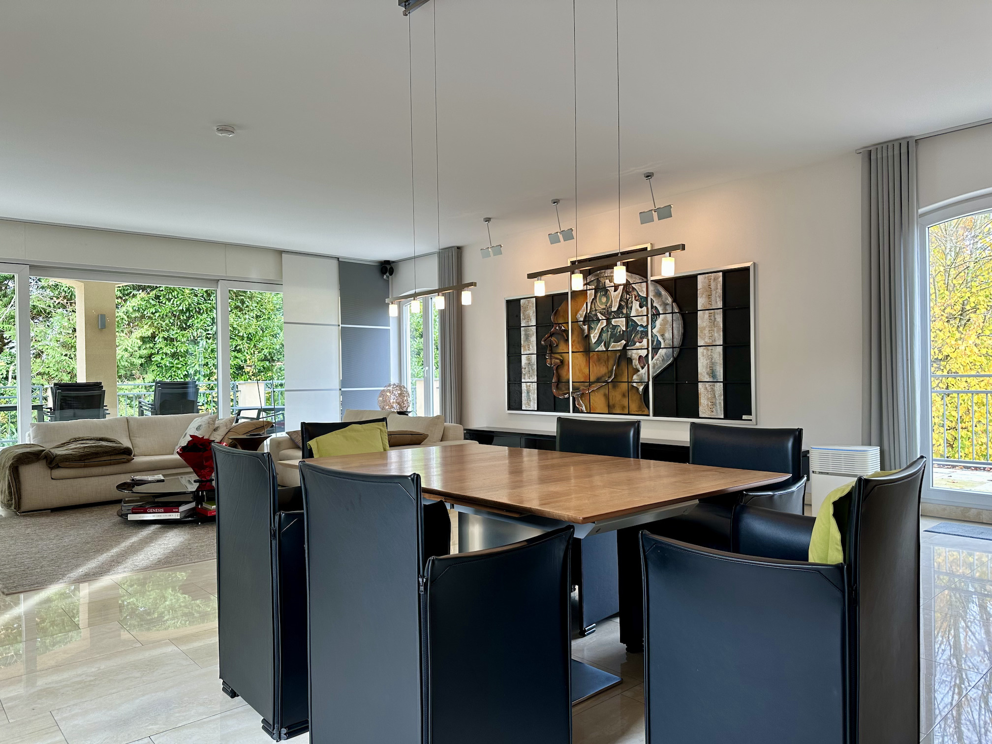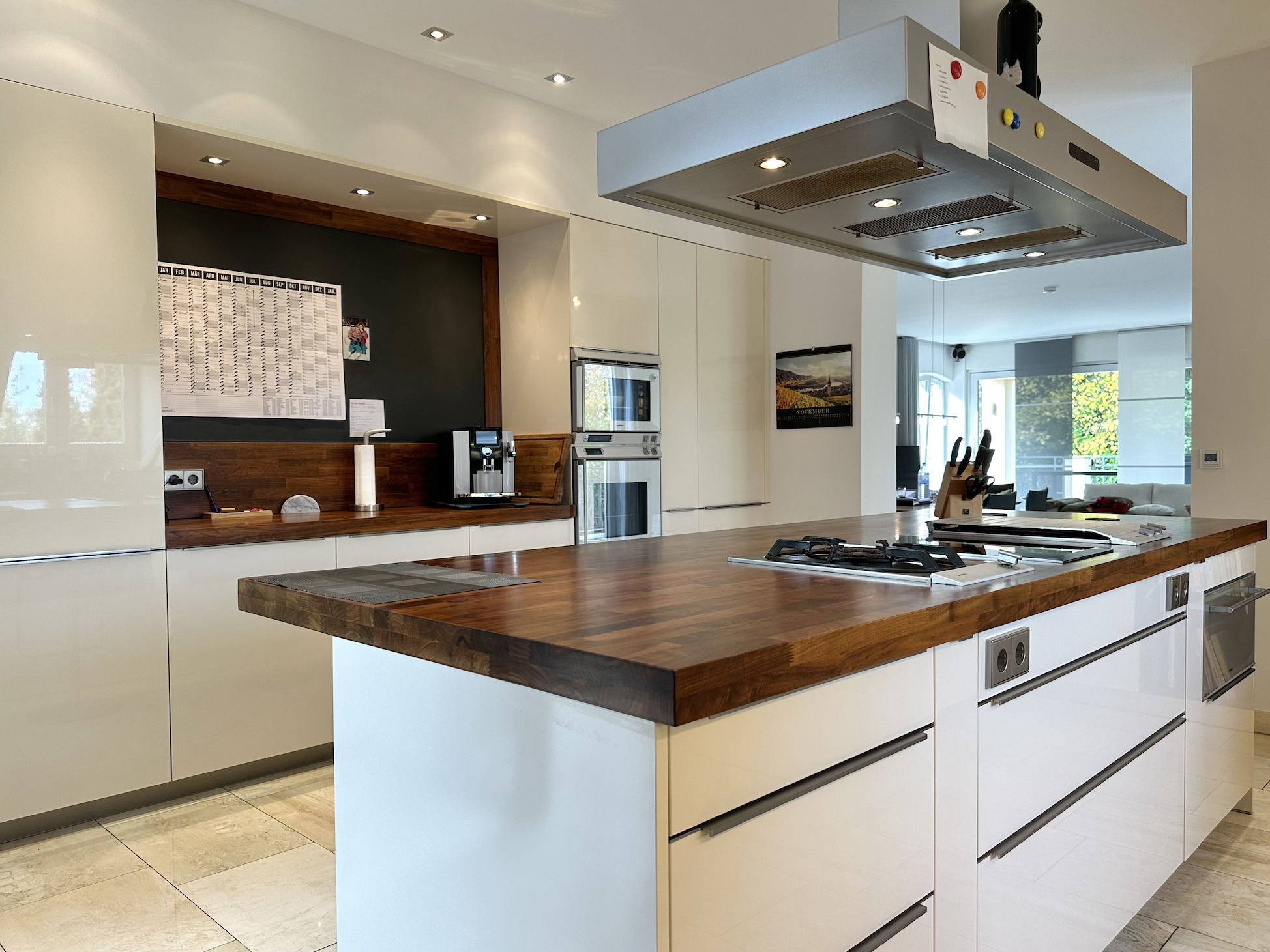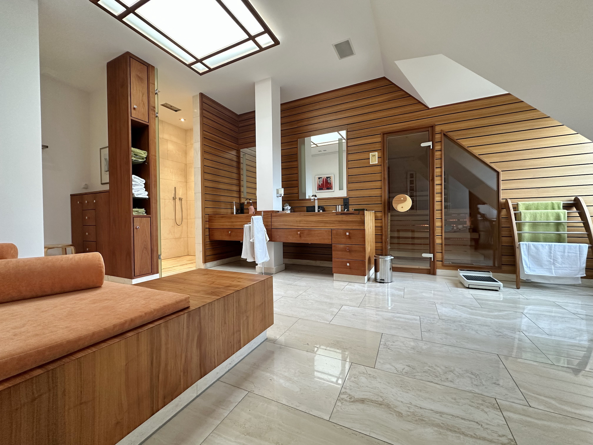 Der edle Natursteinboden (Travertin) zieht sich harmonisch durch alle Räume.