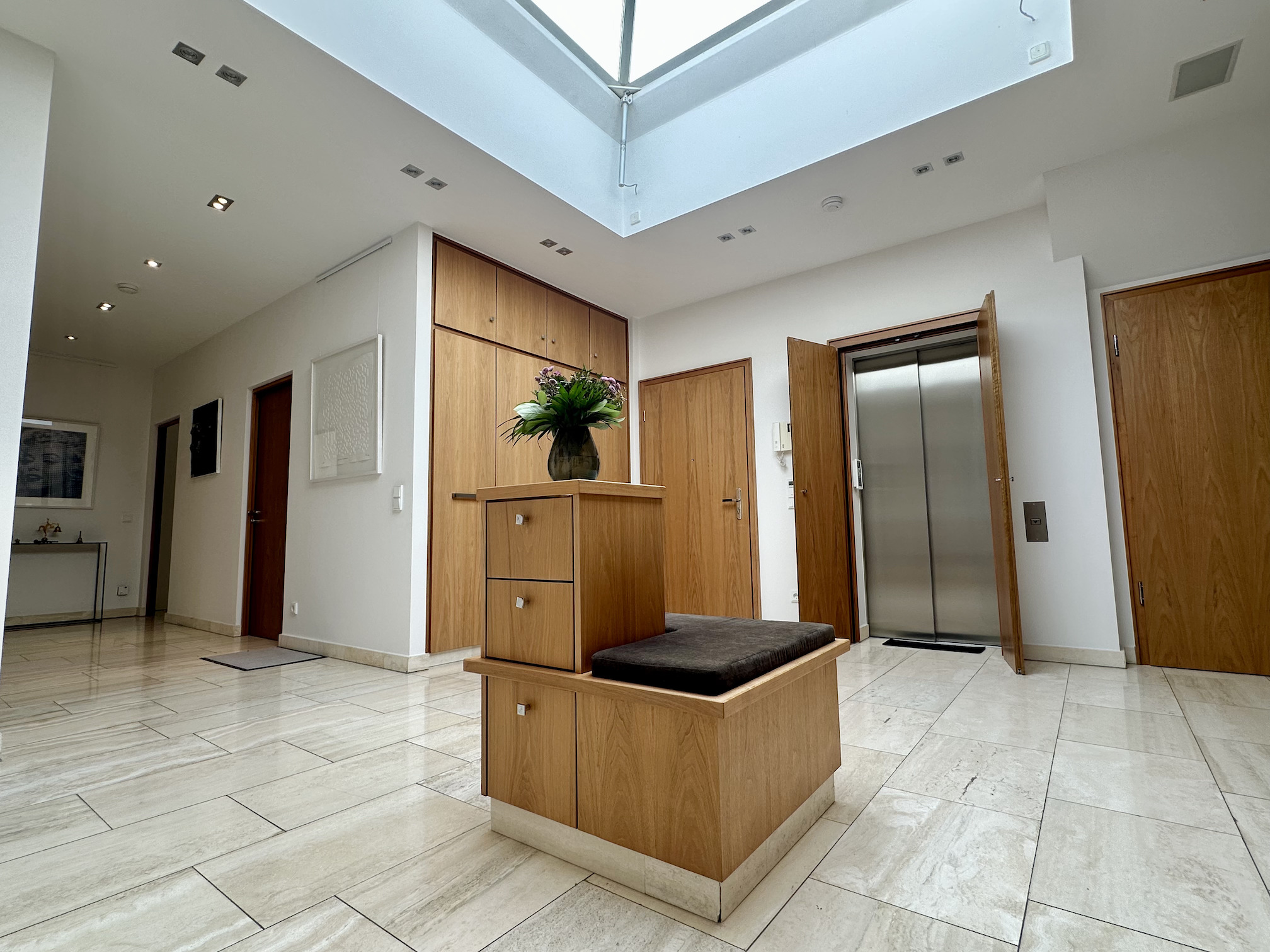 Über einen Aufzug gelangt man direkt in das repräsentative Entrée der Wohnung mit einer Deckenhöhe von 2,80 m. Von hier aus öffnen sich sowohl der Wohn- als auch der Schlafbereich.